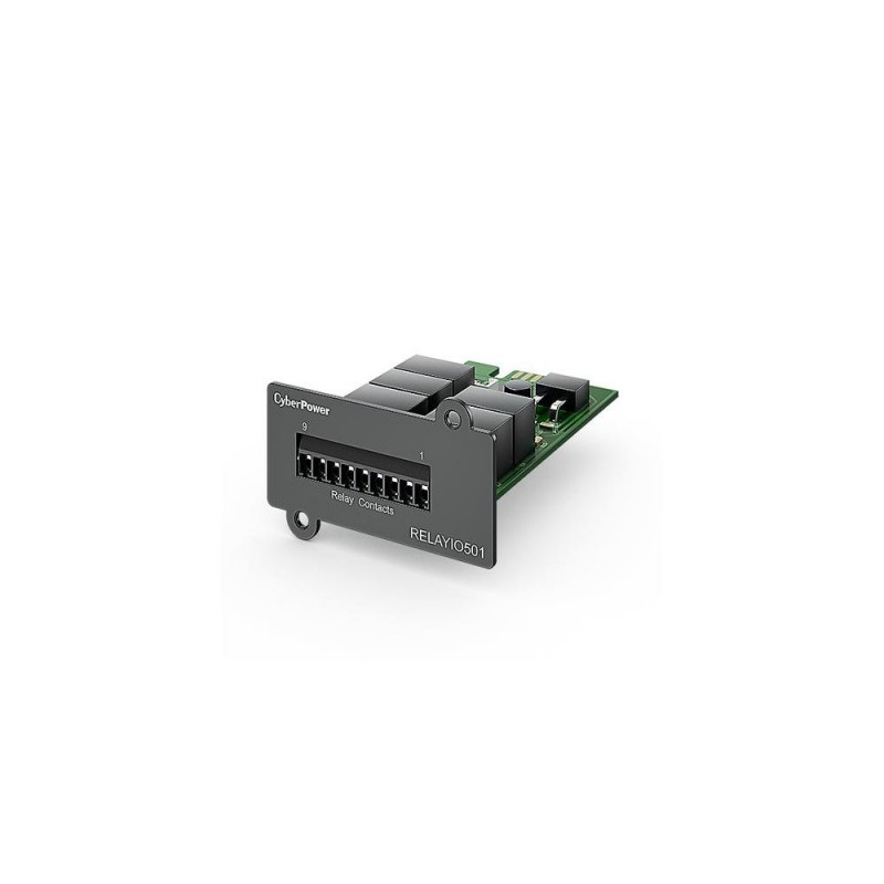 CyberPower RELAYIO501 is an optional management add-on to specific CyberPower UPS series. After inserting the card into the expansion port on the UPS, the card can execute multiple alerts whenever power issues occur, including UPS failures, overloads, over temperature etc. In addition, the card provides one input contact for remote UPS shutdown in battery mode. <br><br>Featuring a dry contact interface, the card is able to provide ON/OFF control of connected devices, such as triggering emergency alarms, exit lights, generators, and more. With its hot-swappable design, the UPS can remain ON while installing this product.CyberPower RELAYIO501. Product colour: Black, Compatibility: PR1000ELCD PR1500ELCD PR750ELCD PR750ELCDGR PR750ELCDN PR1000ERT2U PR1000ERTXL2U PR1500ERT2U.... Compliance certificates: Federal Communications Commission (FCC), RoHS, Certification: FCC B. Width: 54 mm, Depth: 76.5 mm, Height: 36.1 mm. Quantity per pack: 1 pc(s). Package width: 168 mm, Package depth: 162 mm, Package height: 58 mm