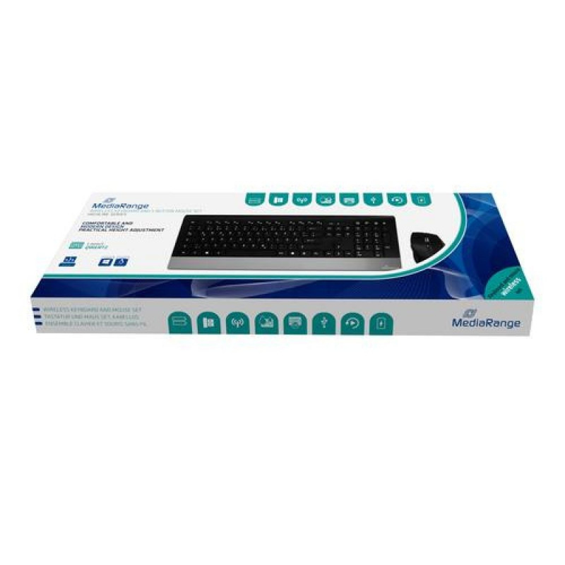 MediaRange input devices are perfect for all applications in the office or at home. Our set, consisting of a wireless keyboard and mouse, can be quickly and easily connected via the USB wireless receiver with any computer and is ready to use with all common operating systems. With more than 10 million keystrokes and splash protection, our keyboards are perfectly protected against everyday wear and tear. The practical height adjustment allows you a better writing comfort.MediaRange MROS105. Keyboard form factor: Full-size (100%). Keyboard style: Straight. Connectivity technology: Wireless, Device interface: RF Wireless, Keyboard key switch: Mechanical, Keyboard layout: QWERTZ, Keyboard number of keys: 107. Wrist rest. Recommended usage: Home. Product colour: Black, Silver. Mouse included