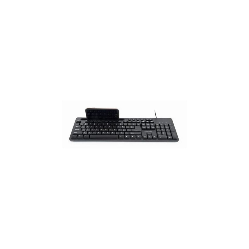 Standard size multimedia keyboard<br>6 multimedia hotkeys for internet and music<br>Practical holder for smartphonesGembird KB-UM-108. Keyboard form factor: Full-size (100%), Connectivity technology: Wired, Device interface: USB, Keyboard layout: QWERTY, Keyboard number of keys: 104. Cable length: 1.5 m. USB hub. Product colour: Black