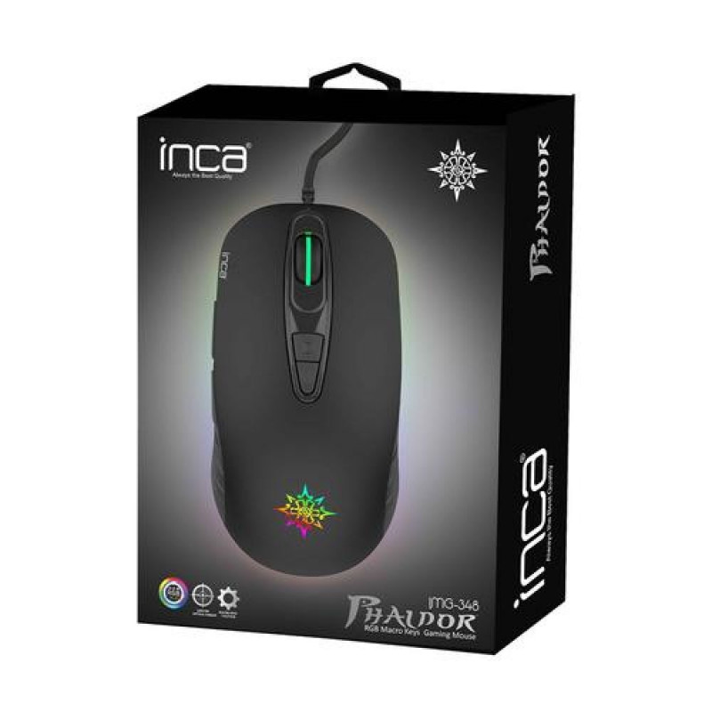 <br />Inca IMG-348. Form factor: Right-hand. Movement detection technology: Optical, Device interface: USB Type-A, Movement resolution: 3200 DPI, Buttons quantity: 7, Scroll type: Wheel. Power source: Cable. Product colour: Black