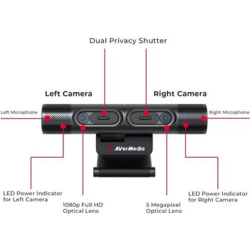 <b>MORE THAN A WEBCAM.</b>The DUALCAM PW313D is a 2-in-1 webcam equipped with two cameras to capture two different angles simultaneously. The combination of a webcam and doc cam captures both yourself and any other object or documents on your table. It is a reliable video and audio device for video conferences, online teaching, and online tutoring.<b>2-IN-1 WEBCAM</b>Size and resolution play a partWith an innovative design that is both lightweight and portable, making it easy to carry and use with high-quality communication, show yourself and share documents and other materials during video conference calls or remote teaching easily.<b>FLEXIBLE MOUNTING AND SETUP</b>Mount on any monitor or laptop with the universal mounting clip or attach to a tripod (1/4“ thread) to help you find the most optimal setup angle.<b>STAY PROTECTED.</b>The DualCam PW313D has built-in privacy shutters (webcam cover) to prevent unintentional capture and keep yourself safe.<b>DUAL MICROPHONES WITH AI NOISE REDUCTION</b>Two built-in microphones, one on each side of the webcam, capture a wider and more immersive sound field. The AI noise reduction feature amplifys the speaker’s natural voice and removes ambient noises. The microphones capture audio naturally and clearly up to 3 m/9.8 ft. in all directions.<b>EASY TO USE.</b>Simply plug the webcam into your computer's USB 2.0 port to begin using.<b>ENRICH YOUR ONLINE TEACHING / MEETINGS</b>We offer a way to add more visuals and information to your teaching or meeting. For example, easily show your handwritten work, graphs, drawings, or a demonstration in a video conference or lecture.AVerMedia PW313D. Megapixel (approx.): 5 MP, Maximum video resolution: 2592 x 1944 pixels, Camera HD type: Full HD. Interface: USB 2.0, Product colour: Black, Mounting type: Clip. Windows operating systems supported: Windows 10, Windows 7, Mac operating systems supported: Mac OS X 10.15 Catalina, Mac OS X 10.15.3 Catalina, Mac OS X 11.0 Big Sur. Minimum processor speed: 2.7 GHz, Minimum RAM: 2048 MB. Country of origin: Taiwan