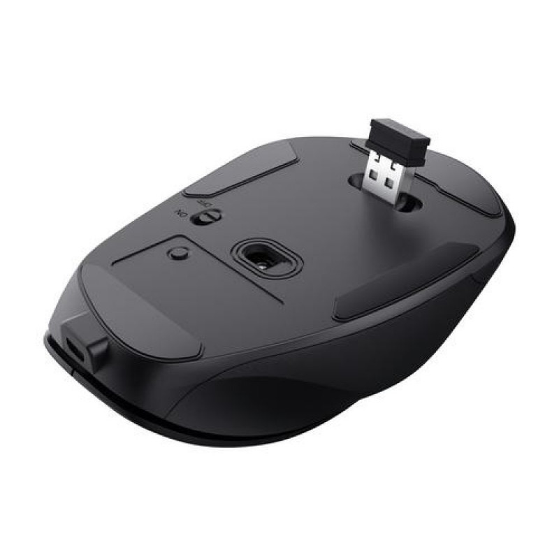 <b>Home, office, and environmentally friendly</b><br>Wherever you’re working, your mind can rest easy – the Fyda mouse is made from 50% recycled materials.<br><br><b>No batteries? No problem</b><br>The Fyda is fully wireless, with a 10m range, and rechargeable – meaning no batteries, ever. Out of juice? Just connect with the included micro-USB cable and power up.<br><br><b>All-day comfort</b><br>A curved design offers hours of working comfort, keeping your hand and fingers fresh even on the busiest of days.<br><br><b>Finger(s) on the button</b><br>With 6 easily accessible buttons – for your fingers, thumbs, and to adjust DPI from 600 to 5000 – you’re always in complete control.Trust Fyda Wireless mouse. Form factor: Right-hand. Movement detection technology: Optical, Device interface: RF Wireless + USB Type-A, Movement resolution: 2400 DPI, Buttons type: Pressed buttons, Buttons quantity: 6, Scroll type: Wheel. Power source: Batteries. Product colour: Black
