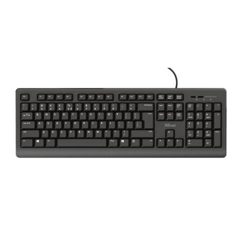 Full-size keyboard with silent keys and spill-resistant design<br><br><b>Cover the Basics</b><br><br>Keyboards come in all shapes and sizes, but what if you only need to cover the basics? The Trust Primo does exactly that. It has a full-size layout, spill resistant keys and it’s height adjustable. And thanks to the silent keys, you will type for hours on end without bothering your co-workers. The Primo does exactly what you want it to do.<br><br><b>Comfort</b><br><br>A good keyboard needs to be comfortable to use. The low profile keys in this full-size keyboard and the fold-out feet provide exactly the comfort you need to focus on your work. You don’t even have to worry about spilling something on the Primo, as the spill resistant design will let you continue your work without hassle. Just poor yourself a new cup of coffee and let’s go.<br><br><b>Easy</b><br><br>Plug in the 180cm long USB cable and you’re good. When you’ve got work to do, you don’t want to worry about installing software or setting macros. The Primo is a workhorse so you can focus on the job at hand.Trust Primo. Keyboard form factor: Full-size (100%). Keyboard style: Straight. Connectivity technology: Wired, Device interface: USB, Keyboard key switch: Membrane, Keyboard layout: QWERTY, Keyboard number of keys: 104. Cable length: 1.8 m. Recommended usage: Universal. Product colour: Black