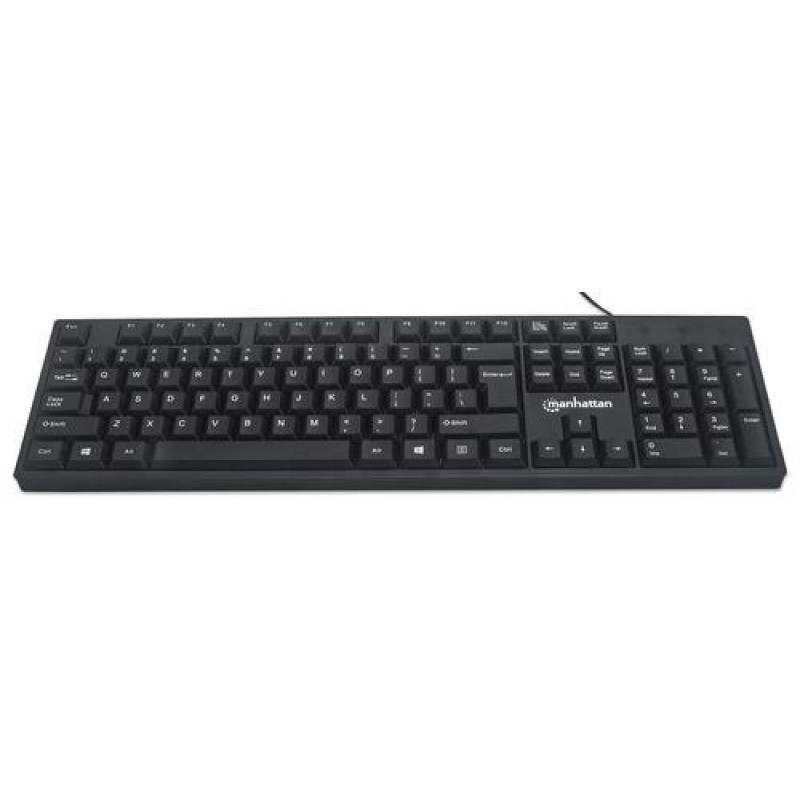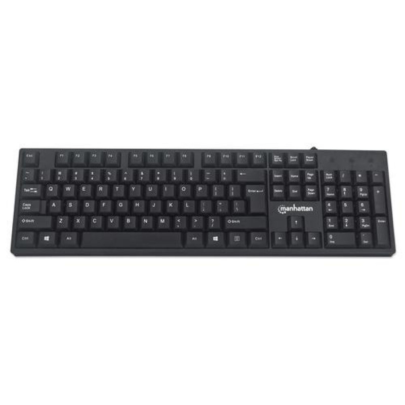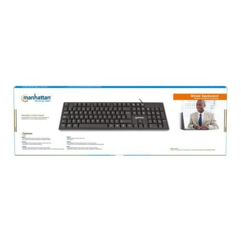 <b>A keyboard designed to improve your productivity</b><br>The Manhattan Wired Keyboard combines excellent value with comfort and durability. The Wired Keyboard offers a robust key structure, highly responsive keys, an easy-access command panel, and a full-sized numeric keypad that provide the immediate familiarity of the modern keyboard. <br><br>This productivity booster is smartly designed to work seamlessly with your current computing setup, so your comfort and enjoyment are assured. Whether navigating expansive spreadsheets, entering numeric data, or typing up reports, the Manhattan Wired Keyboard is the perfect replacement or complement to any computer setup.Manhattan Keyboard USB Wired, Black, Full Size Keys, Cable 1.5m, USB-A connection, Plug and Play, Three Year Warranty, Retail Boxed. Keyboard form factor: Full-size (100%). Keyboard style: Straight. Connectivity technology: Wired, Device interface: USB, Keyboard key switch: Mechanical, Keyboard layout: QWERTY, Keyboard number of keys: 104. Cable length: 1.5 m. Recommended usage: Office. Product colour: Black