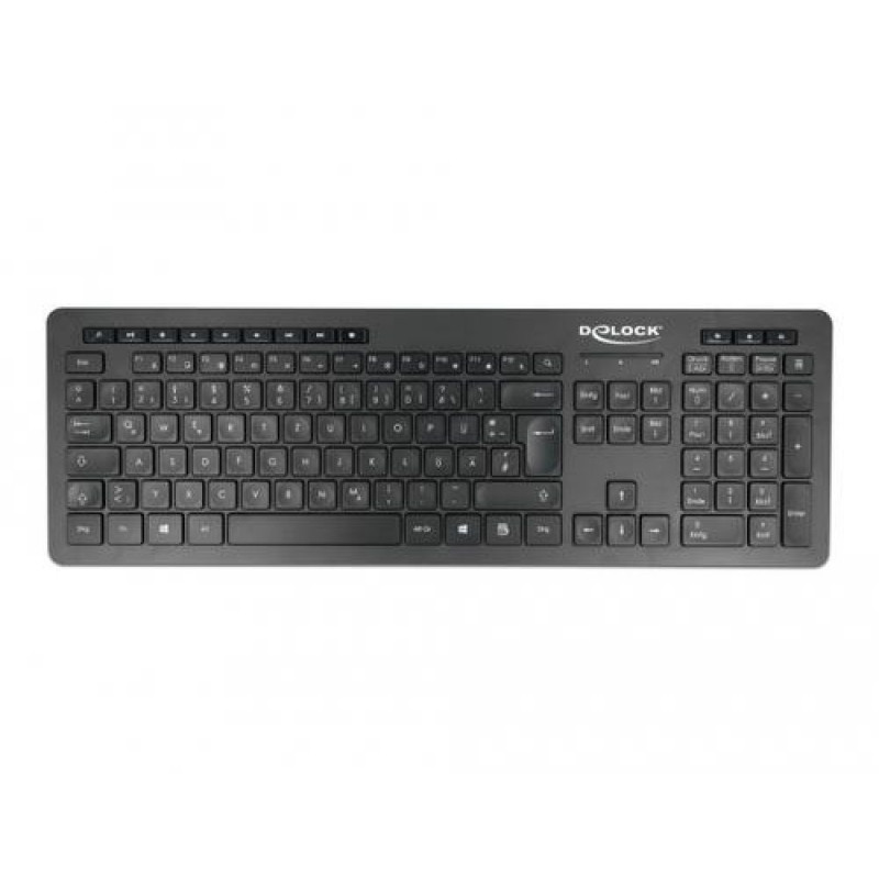 This wireless USB keyboard by Delock with different multimedia keys brings silence into every working environment. Whether e.g. in an open plan office or at home, the Delock keyboard supports, due to its silent keys, noiseless and pleasant working on the computer. Also the click feeling of this keyboard does not change, despite its reduced click sound.<br><br><b>Soft keystroke</b><br>Due to its flat key caps, the Delock keyboard supports a pleasant and soft keystroke.<br><br><b>Setting of the position</b><br>The two foldable stands help to set the keyboard into the right level.DeLOCK 12004. Keyboard form factor: Full-size (100%). Keyboard style: Straight. Connectivity technology: Wired, Device interface: USB, Keyboard layout: QWERTZ, Recommended usage: Home. Product colour: Black