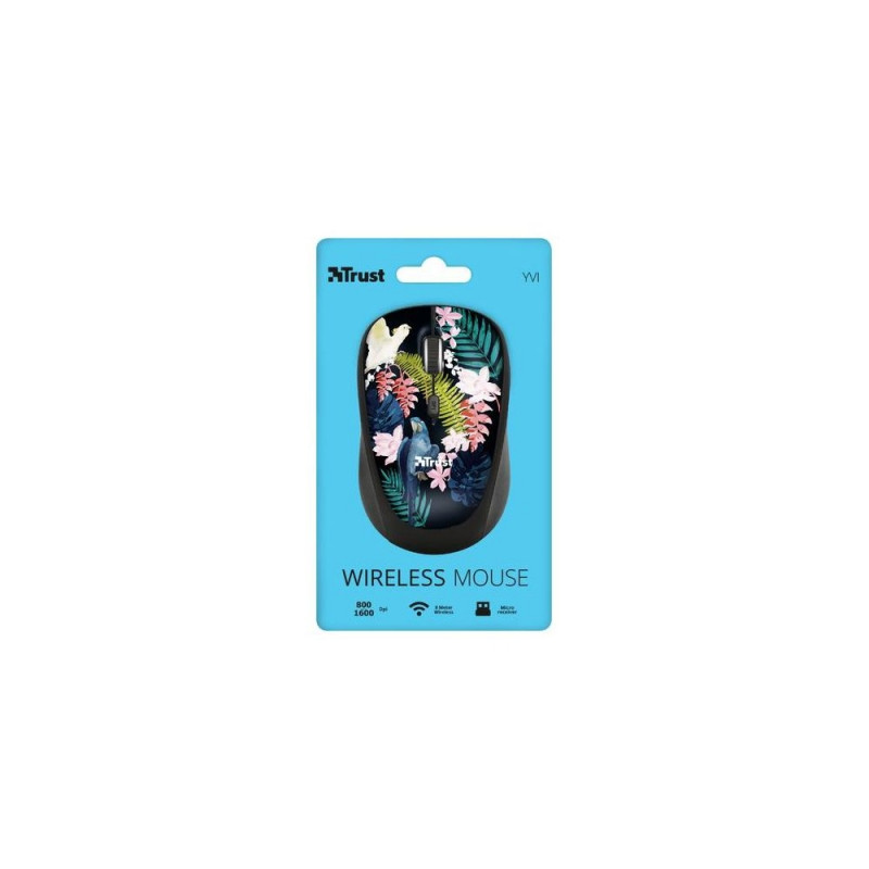 Compact wireless optical mouse with comfortable shape<br><br><b>Colourful and convenient<br></b><br>The Trust Yvi wireless mouse combines functionality with colourful designs. Its compact shape makes it the perfect travel companion. Keep it in your laptop bag or just any pocket, it will fit anywhere.<br><br><b>Wireless technology</b><br><br>The mouse works wirelessly within a range of 8 meters via a storable USB micro receiver. Plug this small receiver into your laptop or PC and you can start using the mouse immediately. When you’re finished, simply leave the receiver in your PC or laptop or store it in the compartment in the mouse. Easily turn the mouse on/off with the power switch to save battery.<br><br><b>Made for everyone</b><br><br>Yvi lets you select your favourite cursor speed with the speed select button (800/1600 DPI). The shape of the mouse is ambidextrous – this means it can be used by right-handed as well as right-handed users. Yvi is handy for everyone!Trust Yvi. Form factor: Ambidextrous. Movement detection technology: Optical, Device interface: RF Wireless, Movement resolution: 1600 DPI, Buttons type: Pressed buttons, Buttons quantity: 4, Scroll type: Wheel. Power source: Batteries. Product colour: Multicolour