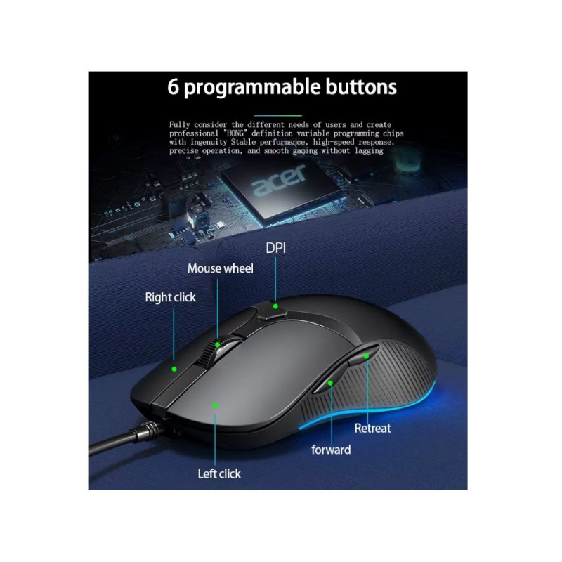 The Acer OMW214 Gaming Mouse is a wired optical mouse designed for gamers seeking high precision and responsiveness. It is equipped with an optical sensor that allows adjustable DPI settings at 800, 1600, 2400, and 3200 DPI, enabling customization of sensitivity for different gaming situations.