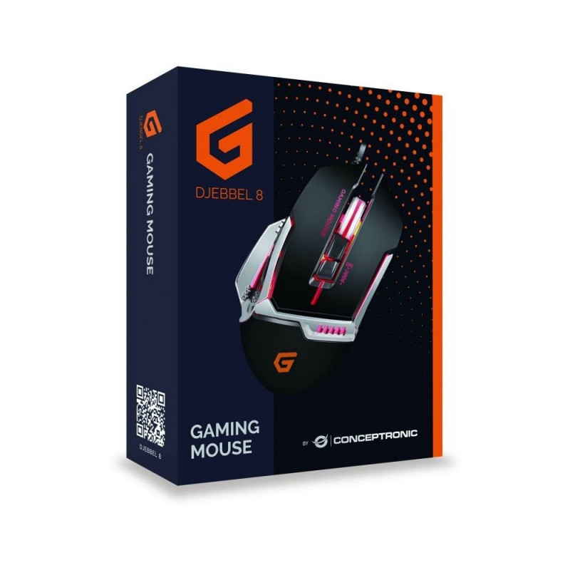 Conceptronic DJEBBEL 8. Liikumise tuvastamise tehnoloogia: optiline, seadme liides: USB Type-A, liikumise eraldusvõime: 4000 DPI, reageerimisaeg: 1 ms, klahvitüüp: vajutatavad klahvid, nuppude arv: 8, kerimise tüüp: rullik, kiirendus (maksimaalne): 20 G. Toiteallikas: kaabel. Toote värvus: must, hõbedane.