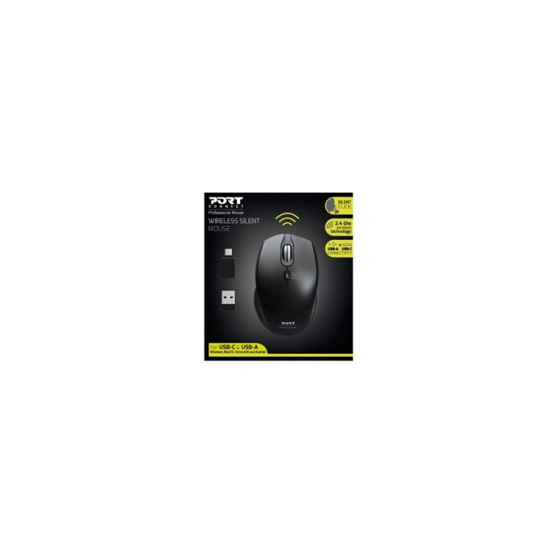 This product is a wireless mouse incorporating 2.4 Ghz technology. Its dual USB-A and USB-C connectivity makes it compatible with all devices.<br><br>3 adjustable speed levels for optimum precision. Its silent click helps create a more peaceful working environment. Its ergonomic and lightweight design is designed to provide optimal comfort during use. 2.4Ghz wireless technology offers freedom of movement up to 20 meters.<br><br>A plug and play installation allowing you to be operational as soon as plugged in. 3 buttons and a scroll wheel, perfect for everyday use. Compatible with Windows, Mac OS, ChromeOS and Android.Port Designs 900713. Form factor: Ambidextrous. Device interface: RF Wireless + USB Type-C, Movement resolution: 1600 DPI, Buttons type: Pressed buttons, Buttons quantity: 3, Scroll type: Wheel. Power source: Batteries. Product colour: Black