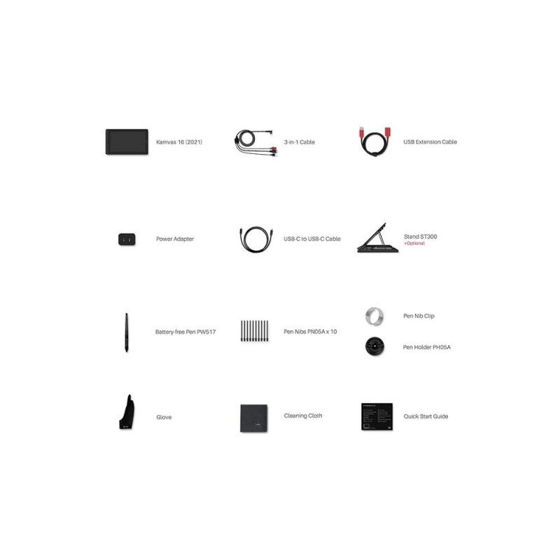 HUION Kamvas 16 (2021) on varustatud Full HD IPS-ekraaniga, mille resolutsioon on 1920x1080 pikslit ja 100% sRGB värvigammat. Komplekti kuulub pliiats, millel on 8192 surveastet, ning 10 programmeeritavat nuppu isiklike otseteede loomiseks.