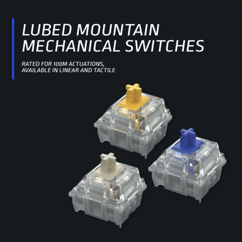 Sujuvaks ja vaikseks kasutamiseks loodud eritellimusel MOUNTAIN Linear 45 ja Tactile 55 lülitid sobivad ideaalselt nii mänguritele kui ka professionaalidele. Tehases määritud lülitid on nauding nii silmale kui kõrvale. Everest 60 toetab ka kõiki teisi 3-kontaktilisi paneelile paigaldatavaid või 5-kontaktilisi PCB-le paigaldatavaid lüliteid.