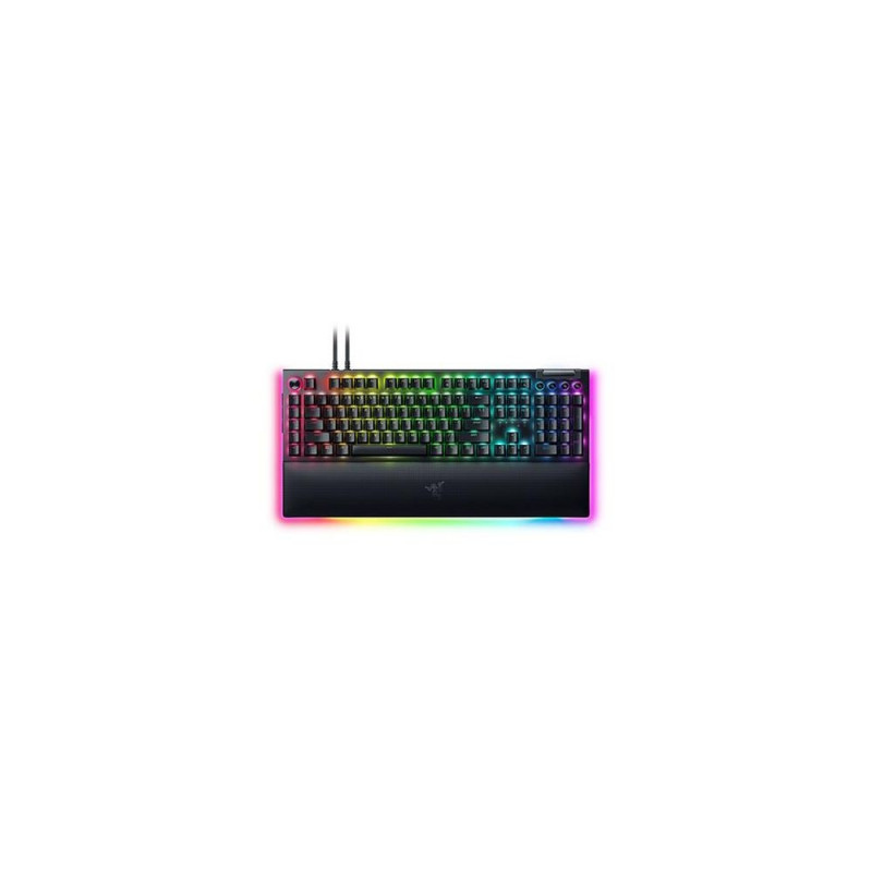 <b>RAZER BLACKWIDOW V4 PRO</b><br>FULL-BLOWN BATTLESTATION IMMERSION<br>Empower your play with a centerpiece that elevates your entire setup. Enter the next phase of battlestation evolution with the ultimate mechanical gaming keyboard. Take full command with a set of features designed for advanced control, and enhance your immersion with full-blown Razer Chroma™ RGB.<br><br><b>IMMERSIVE UNDERGLOW AND PER-KEY LIGHTING</b><br>POWERED BY RAZER CHROMA™ RGB<br>Featuring per-key lighting and a striking underglow that highlights the keyboard from more angles, sync it with your battlestation and enjoy greater immersion for hundreds of integrated games.<br><br><b>RAZER COMMAND DIAL AND 8 DEDICATED MACRO KEYS</b><br>MAXIMUM COMMANDS AT YOUR FINGERTIPS<br>Assume greater control over your battlestation by assigning a custom function to the keyboard’s programmable dial. Game with greater command using a set of macro keys for essential keybinds.<br><br><b>RAZER MECHANICAL SWITCHES</b><br>QUICK, PRECISE EXECUTION<br>Choose between two switches that offer their own distinct feel—the Green Switch for precise actuation with clicky, tactile feedback, or the Yellow Switch for quick actuation that’s smooth and silent.<br><br><b>MAGNETIC PLUSH LEATHERETTE WRIST REST WITH UNDERGLOW</b><br>EXTRA GAMING COMFORT AND FLAIR<br>Designed to provide secure support for long hours of play, the soft, cushioned wrist rest also features Razer Chroma™ RGB—which perfectly lines up with the keyboard’s underglow.<br><br><b>DOUBLESHOT ABS KEYCAPS</b><br>WITHSTANDS INTENSE USE<br>Using a doubleshot molding process to ensure the labelling never wears off, the keycaps also have extra-thick walls which make them extremely tough to withstand intense gaming.<br><br><b>MULTI-FUNCTION ROLLER AND 4 MEDIA KEYS</b><br>CONVENIENT CONTROL<br>Pause, play, skip and tweak everything from brightness to volume—the ultimate convenience as you enjoy your entertainment.<br><br><b>USB PASSTHROUGH</b><br>Connect a mouse or headset conveniently to your PC via a USB port on the keyboard.<br><br><b>DETACHABLE TYPE C CABLES</b><br>Comes with 2 braided Type A to Type C cables for standard keyboard connection and USB passthrough.<br><br><b>5052 ALUMINUM ALLOY CONSTRUCTION</b><br>Greater build durability with a refined finish.<br><br><b>ENHANCED KEYBOARD ACOUSTICS</b><br>Satisfying sound profile with pre-lubed stabilizers and 2 layers of internal sound dampening foam.<br><br><b>UP TO 8000 HZ POLLING RATE</b><br>The fastest response for an edge in competitive gaming.<br><br><b>5 ONBOARD MEMORY PROFILES</b><br>Save any number of custom profiles to the cloud and store up to 5 of your favorite ones on the keyboard.Razer BlackWidow V4 Pro. Keyboard form factor: Full-size (100%). Keyboard style: Straight. Connectivity technology: Wired, Device interface: USB, Keyboard key switch: Mechanical, Keyboard layout: QWERTZ. Backlight type: RGB LED, Wrist rest. Recommended usage: Gaming. Product colour: Black