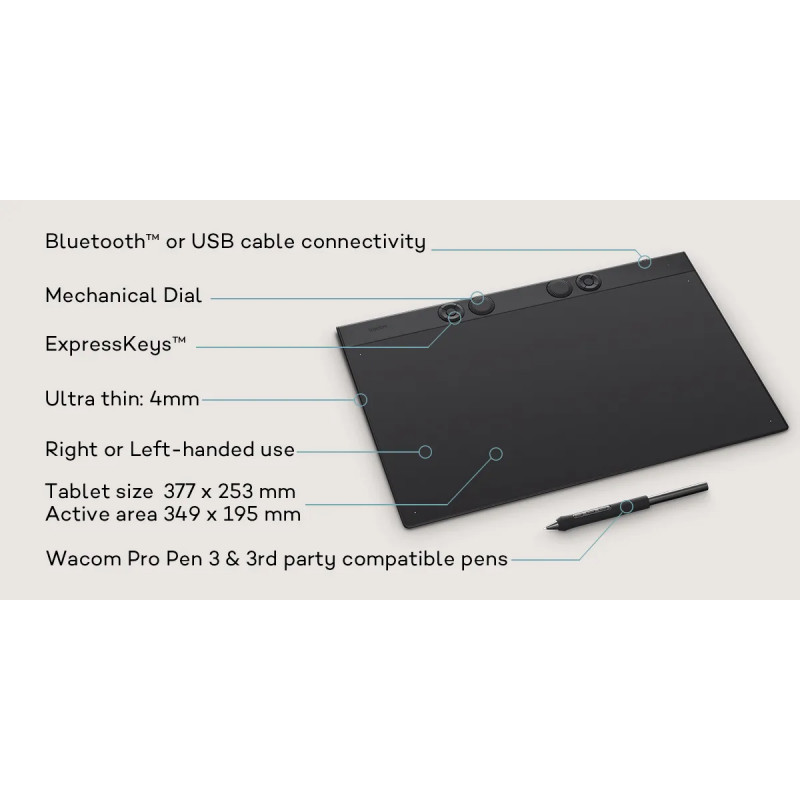 Intuos Pro Large kasutab täiustatud tekstuurpinda ning kolme tüüpi vastupidavaid otsikuid: Standard (POM), vilt ja kumm. Parem otsikute eluiga vähendab vajadust neid tihti vahetada. Uus USB/Bluetooth valikunupp võimaldab hõlpsasti lülituda mitme seadme vahel, muutes töövoo paindlikumaks ja vähendades kaablite kulumist.