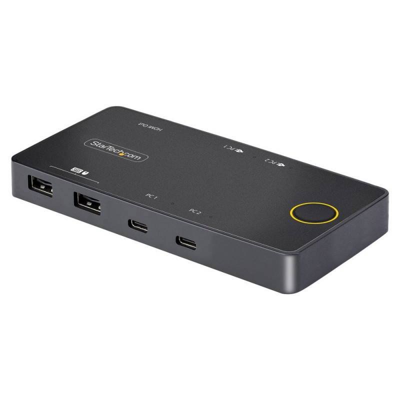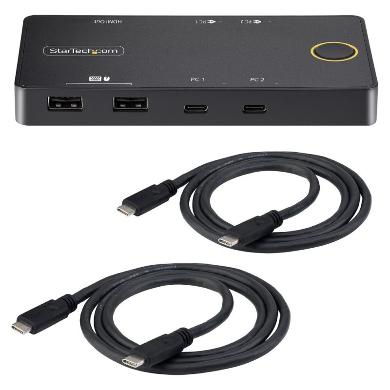 StarTech.com C2-H46-UC2-PD-KVM. Klaviatuuri pordi tüüp: USB, hiire pordi tüüp: USB, video pordi tüüp: HDMI. HD-tüüp: 4K Ultra HD, maksimaalne eraldusvõime: 4096 x 2160 pikslit, videolaius: 75 Hz. Toote värvus: must, korpuse materjal: akrüülnitriil-butadieen-stüreen (ABS), kaabli pikkus: 1 m. Energiatarve (tavakasutusel): 10 W, USB-toiteallikas kuni: 100 W. Vastavussertifikaadid: CE, RoHS