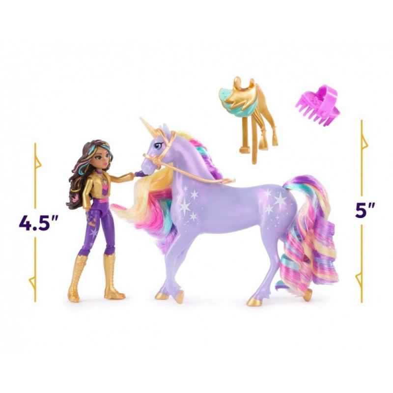 Tähista ratsaniku ja ükssarviku vahelist sidet komplektiga Ükssarvikute Akadeemia: Sophia ja Täht! See komplekt, mis on inspireeritud NETFLIXi animasarjast ja laste lemmikraamatusarjast, kus peamine roll on sõprusel, ärgitab kujutlusvõimet lõpututeks lugudeks. 11 cm kõrgusel Sophial on realistlikud, täpselt kujundatud detailid ning 7 painutamiskohta, mis võimaldavad teda panna dünaamilistesse poosidesse. Täht on 13 cm kõrge ja täiendab Sophia välimust Maagia Valguse märkide ning kammimiseks mõeldud vikerkaarekarva laka ja sabaga (komplektis on kaasas ka kamm). Mängu ajal lase Sophial Tähe selga istuda ja seiklema minna! Tänu eemaldatavale päitsmele ja sadulale saab Sophia Tähe seljas turvaliselt ja kindlalt istuda. Veelgi rohkem võimalusi Ükssarvikute Akadeemia maailma avastamiseks koos lemmiktegelastega leiad teistest väikestest nukkudest, sealhulgas Avast, Laylast, Isabelist, Valentinast ja nende ükssarvikutest (komplektid müügil eraldi), et laiendada raamatutest ja sarjast tuttavat maailma! Ükssarvikute Akadeemia mänguasjad on suurepärased jõulu- või tähtpäevakingitused lastele, kellele meeldivad mänguükssarvikud ja -hobused, nukud ja aksessuaarid, nukumajad, kollektsioneeritavad esemed, kaisuloomad ja palju muud. Ela kaasa lummavatele seiklustele Ükssarvikute Akadeemias Sophia ja Tähe komplektiga!