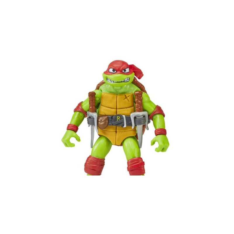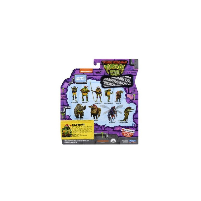 Raphael has a big attitude and big dreams, which are (in no particular order) to punch someone so hard they throw up and to be a mixed martial arts fighter. Together, he and his brothers leave their sewer for the city above, fighting crime and learning that there is no "i" in team (even if Raph insists that there is technically a "me" in it).<br><br>AUTHENTIC: Raphael stands 4.65" tall and is highly detailed with individual sculpting and decoration to match his movie character.<br>HIGHLY POSEABLE: Raph has 12 points of articulation for great, action-packed battle poses.<br>ACCESSORIES: Raph comes ready for battle with his iconic twin sais and a separate weapons rack loaded with different accessories and a baby turtle!<br>MOVIE PACKAGING: Raph comes in a highly decorated blister card package with bright, bold details that includes TMNT Mutant Mayhem movie branding<br>COLLECT THEM ALL: Collect all the TMNT Mutant Mayhem action figures and accessories from Playmates Toys, your Teenage Mutant Ninja Turtles Toy HeadquartersTeenage Mutant Ninja Turtles Raphael Basic Figure. Recommended age (min): 4 yr(s), Theme: Ninja Turtles, Product colour: Multicolour, Material: Plastic