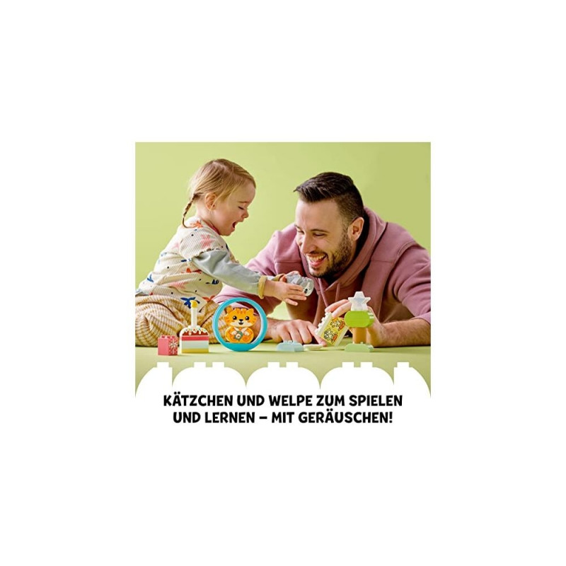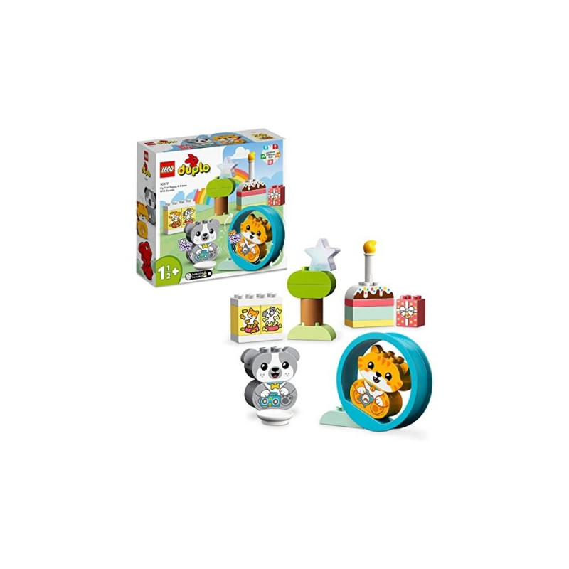 Kids 18 months and older can enjoy learning and building with the LEGO DUPLO My First Puppy & Kitten - With Sound (10977) toy for toddlers. Preschoolers can build their own creations with cute animal figures and large LEGO DUPLO bricks. This LEGO DUPLO set includes a cute cat toy and a cute dog toy, each consisting of 2 toddler-friendly parts, making it easy to build LEGO DUPLO animals. Your little animal fan will love putting their pet in the rolling toy ring. The sound feature included for each animal expands play and learning opportunities with sounds that indicate it's time to eat, play, sleep etc - a great way to teach children under five about daily routines and care teach from pets. Kids can pretend feeding their toy animals with the feeding bricks and bowl accessories, and build a birthday cake, present and star tree with the included LEGO DUPLO bricks to expand the creative fun.