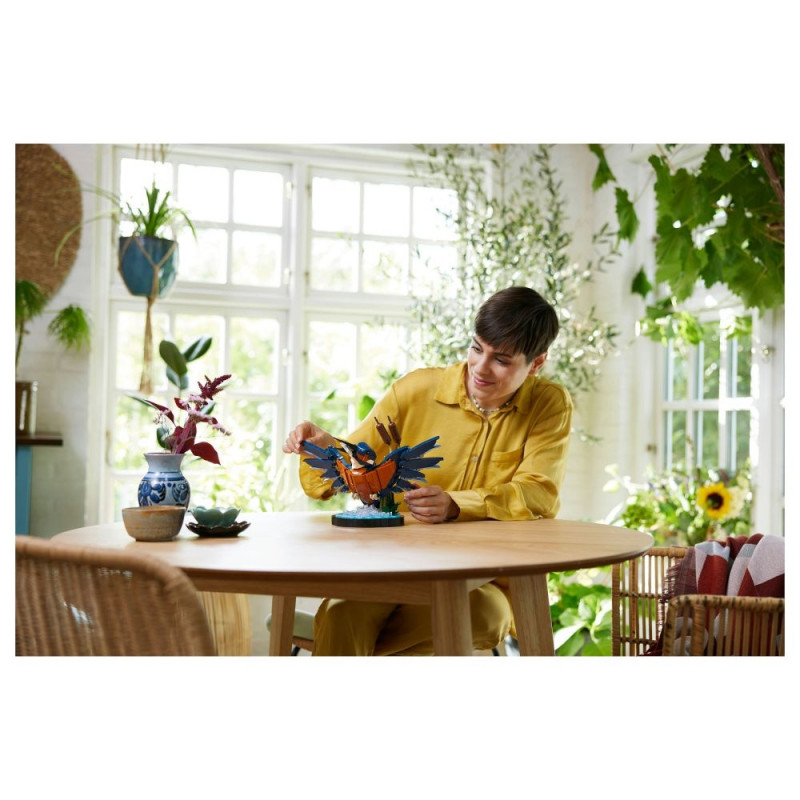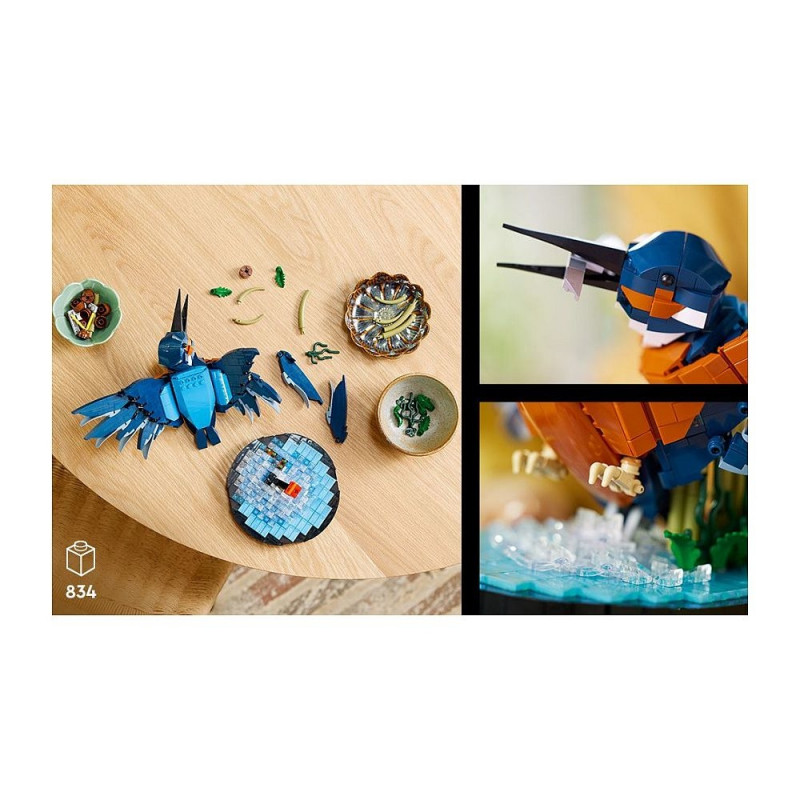 Komplektis on jäädvustatud jäälinnu iseloomulikud tunnused: säravsinine ja oranž sulestik, pikk nokk ning elegantne poos oksal. Lisaks linnule kuulub komplekti ka detailne ehitatav oks, millel on õrn vesiroos, luues harmoonilise ja esteetilise kompositsiooni. See mudel sobib suurepäraselt nii kingituseks loodus- ja linnusõpradele kui ka stiilseks sisustuselemendiks igasse ruumi.