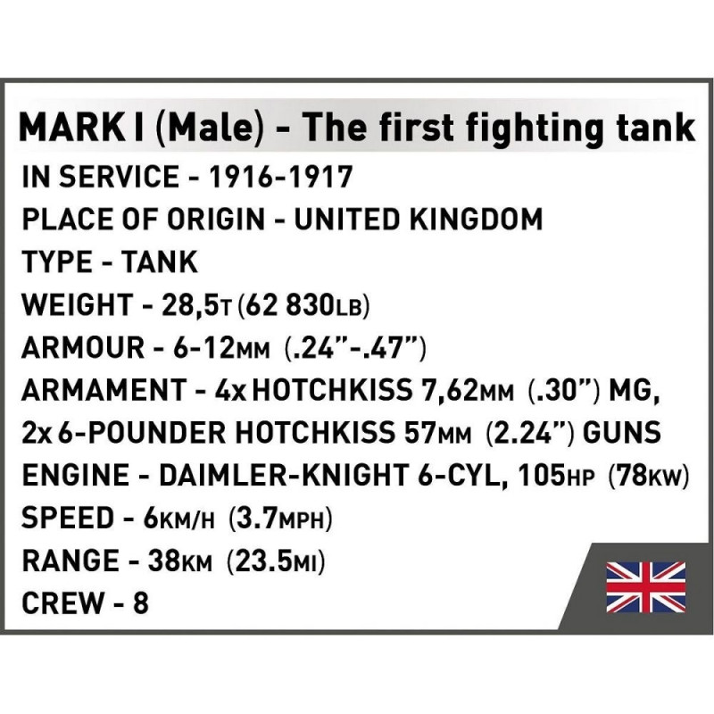 Suur sõda käivitas ajastu, mida tuntakse tänaseni kui terasest elevantide ajastut. Just siis sündis ühe esimese tanki projekt! MARK I (Male) numbriga C.19 saad ehitada 878 COBI konstruktoriklotsist. Mudeli pikkus on 28 cm. Tänu 1:35 mudeliskaalale sobib see COBI figuuridega ning teiste sama mõõtu sõidukitega. Tankil on töötav roomiksüsteem, pöörlevad kahurid ja avatavad luugid. Märgised ja embleemid on valmistatud värvilistest klotsidest ja vastupidavatest trükistest, mis ei kulu isegi intensiivsel kasutamisel. Komplekti kuulub Suure sõja aegse Briti tankisti figuur, samuti komplekti nimega silt ja The Tank Museum’i logoga tahvel – just selles muuseumis asub originaaltank, mille järgi see komplekt on loodud.