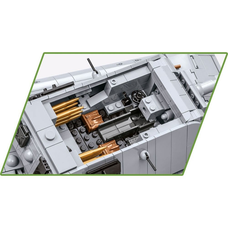 PANZERKAMPFWAGEN E-100 on loodud muljetavaldavas 1:28 mõõtkavas, kasutades 1511 detaili, ning selle pikkus on lausa 37 cm. Suur mudel võimaldab kujundada nii torni kui ka sõiduki sisemuse. Mudelil on ligipääs hooldusluugile, mille all asub eemaldatav mootor. Täiendavateks funktsioonideks on pöörlev torn, liigutatav kahur, ligipääs meeskonnaluukidele ning töötav roomiksüsteem. Komplekti kuulub ka väga huvitav tankisti figuur, millel on trükk seljal. Nii suur mudel pakub tunde põnevat ehitamist ning saab sinu kollektsiooni domineerivaks eksponaadiks! Ehita ajalugu, klots klotsi haaval!