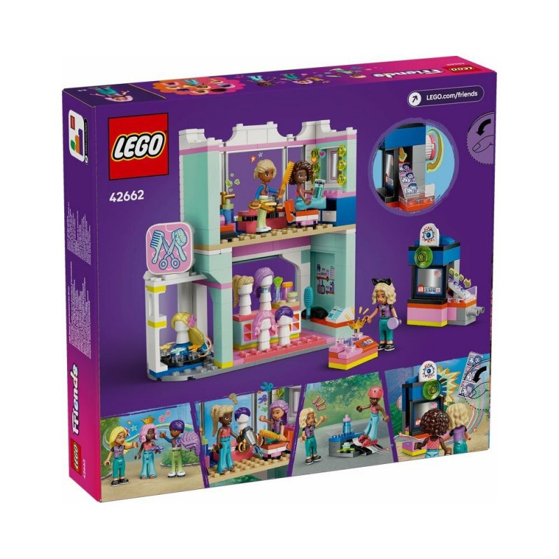 Seitsmeaastased ja vanemad lapsed saavad rõõmuga rollimänge mängida LEGO® Friends Juuksurisalongi ja aksessuaaripoe (42662) komplektiga. Mänguasjas on kolm LEGO Friendsi mininukku ja rohkelt juuksehooldusaksessuaare loovaks mänguks. See komplekt võimaldab välja mõelda lugusid sõpradest Novast ja Aliyast, kes veedavad päeva, proovides juuksur Faraji käe all uusi soenguid. Kahekorruselises hoones asub ülemisel korrusel juuksurisalong, kus on soengutoolid, föönid, harjad ja parukad, mida tegelased saavad proovida. Alumisel korrusel on aksessuaaripood, kust leiab veelgi rohkem parukaid ja lahedaid aksessuaare, mis täiendavad tegelaste uut välimust. Lapsed saavad panna tegelased fotokabiini ja lasta Aliya ja Nova pildid masinast välja hüpata. Komplektis on ka pöörlev väljapanek, rulluisuramp ja kiiver. Avasta ka teisi põnevaid LEGO Friendsi komplekte (müüakse eraldi), et mängida veelgi rohkem sõpruse lugusid.