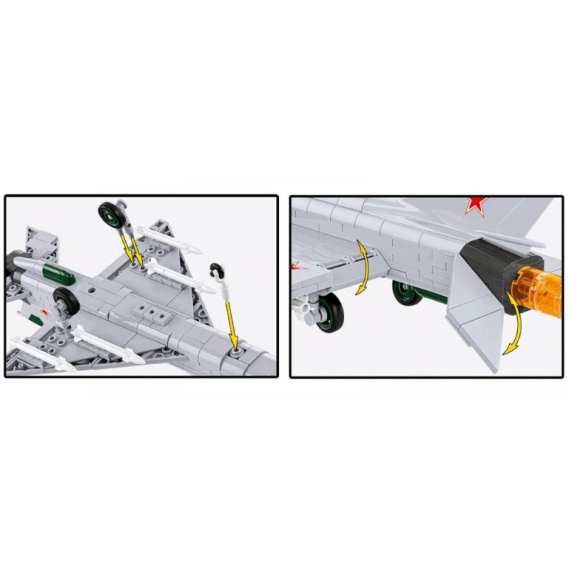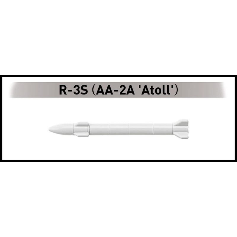 - Realistlik funktsionaalsus – mudelil on liikuvad juhtpinnad, eemaldatavad rattad ja kujutatud reaktiivmootori leek, mis võimaldab taasluua stardi-, lennu- ja maandumisstseene. Tiibade all on R-3S rakettide koopiad – need on Nõukogude lühimaa juhitavad õhk-õhk raketid, mis on koopia Ameerika AIM-9B Sidewinderist.