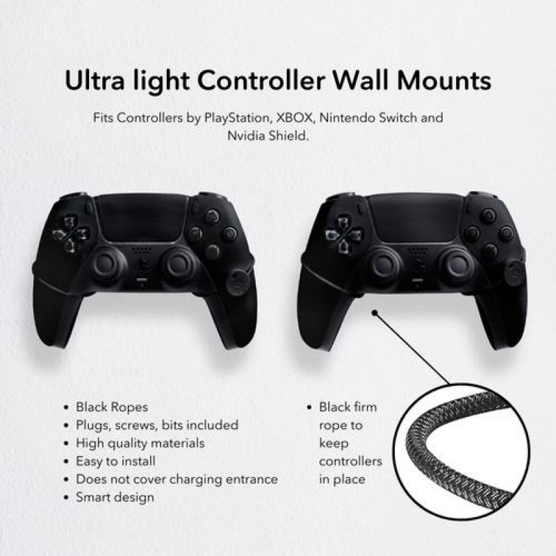 Achieve the ultimate in organization by wall-mounting your PlayStation controllers with FLOATING GRIP Wall Mounts. The universal fit accommodates all PlayStation controller versions, allowing you to bid farewell to clutter and conveniently showcase your controllers. Transform your gaming area into a tidy and visually appealing space.<br><br><b>Bringing Artful Organization to Gaming Spaces: Creative PlayStation Controller Wall Mount Setups<br>Showcasing Customer Creativity: PlayStation Controller Wall Mounts in Action</b><br>Introducing the PlayStation Controller Wall Mounts by FLOATING GRIP – a sleek and innovative solution for organizing and displaying your PlayStation controllers. This package includes two wall mounts designed to securely hold a variety of PlayStation controller generations. The unique rope wall mount design not only keeps your controllers safe and easily accessible but also creates a visually captivating "floating" effect on your wall.<br><br>But that's not all – explore our collection to see how customers have ingeniously displayed their controllers on the wall using the FLOATING GRIP Wall Mounts. Say goodbye to clutter and tangled wires as these wall mounts add a touch of elegance and functionality to your gaming setup, allowing your controllers to become a focal point of your space. Elevate your gaming area with the PlayStation Controller Wall Mounts and enjoy a clutter-free and stylish way to showcase your controllers.<br><br><b>Elevating Safety, Aesthetics, and Accessibility in PlayStation Controller Storage<br>Why is FLOATING GRIP's Rope System the Ultimate Wall Mount Solution for PlayStation Controllers?</b><br>Enjoy the convenience of a single solution for all your PlayStation controller generations. Our wall mounts by FLOATING GRIP are meticulously designed to securely hold any model of PlayStation controller, ensuring a perfect fit every time.<br><br>Experience the visual magic of our unique rope wall mount system. Not only do these mounts keep your controllers safe and easily accessible, but they also create a stunning "floating" illusion on your wall, turning your controllers into captivating pieces of art.<br><br>Transform your gaming area with the functional and stylish organization provided by FLOATING GRIP's wall mounts. By getting your controllers off surfaces and into an eye-catching display, you'll enjoy a clutter-free space that adds a touch of sophistication to your gaming setup.<br><br><b>Maximize Space, Enhance Aesthetics, and Showcase Your Controllers for a Stellar Gaming Setup<br>Elevate Your Gaming Space: Display Your Controllers on the Wall</b><br>Transform your gaming experience by displaying your controllers on the wall. This space-saving solution not only showcases them beautifully but also adds a touch of sophistication to your setup, allowing you to proudly exhibit your collection for an impressive gaming ambiance.<br><br><b>Visual Statement</b><br>Wall-mounted controllers become a unique and eye-catching focal point in your gaming setup. Showcase your collection proudly, transforming your gaming area into a personalized space that reflects your passion for gaming.<br><br><b>Optimal Accessibility</b><br>Wall-mounted PlayStation controllers are always within arm's reach, offering instant access whenever you're ready to game. No more searching for controllers or dealing with tangled cords – just grab and play.<br><br><b>Space Maximization</b><br>By displaying your PlayStation controllers on the wall, you free up valuable surface space. This not only enhances the overall aesthetics of your gaming area but also provides room for other gaming peripherals or decorative elements.<br><br><b>Expand Your Possibilities: Explore These Gaming Setup Enhancements</b><br>While you're here, why not take a look at these products that could take your gaming setup to the next level? Your introduction to FLOATING GRIP is just the start! Delve into our range of offerings, which include captivating LED accessories, top-notch HDMI cables, and remarkable wall mounts. The perfect opportunity to elevate every aspect of your gaming environment awaits you with the innovative options from FLOATING GRIP.<br><br><b>Increased Strength, Enhanced Stability<br>Key Specifications</b><br>Introducing the ultimate solution for organizing and showcasing your prized collection of PlayStation controllers – the PlayStation Controller Wall Mounts by FLOATING GRIP. Designed to provide both functionality and aesthetics, this package includes two meticulously crafted wall mounts, each designed to cradle a set of controllers securely.<br><br><b>Elevate Your PlayStation Gaming Experience with FLOATING GRIP Wall Mounts<br>Why Wall Mount Your PlayStation Controller?</b><br>Invest in the PlayStation Controller Wall Mounts by FLOATING GRIP for a combination of practicality and style that enhances your gaming experience and lets your controllers take center stage in a truly impressive way.Floating Grip FG-PSCO-151B. Gaming platforms supported: PlayStation 5, Product type: Wall mount, Product colour: Black. Package weight: 30 g