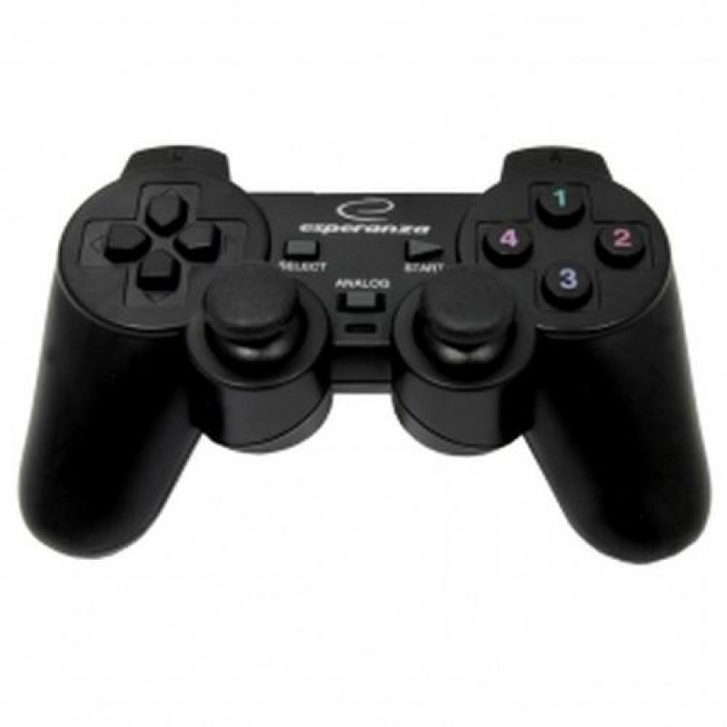 Functional gamepad with vibration. Great working with advanced games. Ergonomic design is comfortable to hold and does not cause discomfort in your hands during the game. 2 analog manipulators 12 action buttons (including 2 buttons in analog sticks), 2 modes (analog and digital) and 8-way D-pad for easy access to most of the features in games. Vibration motors produce additional effects generated by the game. Easy to install. Requires USB 2.0. Compatible with: Windows Me, Windows XP, Windows 2000 SP4, Windows Vista, Windows 7.Esperanza EG106. Device type: Joystick, Gaming platforms supported: PC, Playstation 2, Playstation 3, Gaming control function buttons: D-pad. Connectivity technology: Wired, Device interface: USB 2.0. Product colour: Black, Cable length: 1.8 m. Windows operating systems supported: Windows 2000, Windows 2000 Professional, Windows 7 Enterprise, Windows 7 Enterprise x64, Windows 7...