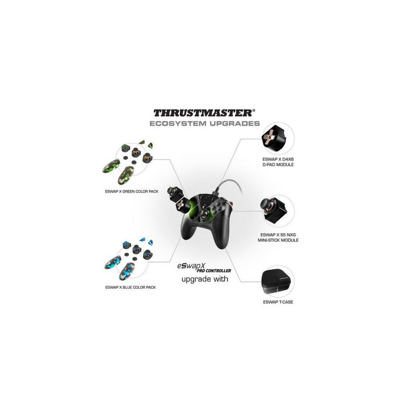 <b>VERSATILITY AND INNOVATION</b><br>- Modular T-MOD technology allows for unlimited renewal and upgrading possibilities.<br>- Your controller can constantly evolve, thanks to its endless ecosystem of modules (color and custom kits, sold separately).<br><br><b>INDUSTRIAL-GRADE COMPONENTS</b><br>- Super-responsive tact switches.<br>- Responsive, clear clicks that you can really feel.<br>- New NXG mini-sticks: rated for 2 million plus activations! <br><br>These next–generation components ensure enhanced precision and resistance.<br>- ABXY and D-pad buttons rated for 5 million plus activations, for an extended lifespan!<br>- Practical and safe: braided cable with proprietary connector, avoiding inadvertent disconnections.<br><br><b>OFFICIAL MICROSOFT XBOX® LICENSED PRODUCT</b><br>- Compatible with Xbox One® and Xbox® Series X.<br>- Compatible with PC (Windows® 10).<br><br><b> ADDITIONAL ERGONOMIC FEATURES</b><br>- 4 extra buttons that can be remapped directly via the controller itself.<br>- Locking catches that let you control the travel of the triggers<br>(RT/LT).<br>- Button bar that lets you control the volume of your headset (not included) and enable/disable its microphone, directly via the controller itself.<br>- Xbox®-style textured, ergonomic triggers.<br>- Save 2 different gaming profiles in the controller’s internal memory: switch between configurations in real time, for instant adaptability!<br><br><b> FREE MULTIFUNCTIONAL PC/XBOX® APP INCLUDED</b><br>- Reprogram buttons (and other controls).<br>- Configure mini-sticks (sensitivity and dead zones).<br>- Configure triggers (sensitivity and dead zones).<br>- Adjust vibration levels for the controller’s handles and triggers (0–100%).<br>- Import/export gaming profiles.<br>- App available for download from the Microsoft/Xbox® Store (accessible directly via the Xbox® console).Thrustmaster eSwap Pro Controller Xbox One. Device type: Gamepad, Gaming platforms supported: Xbox One, Xbox Series S, Gaming control function buttons: D-pad. Connectivity technology: Wired, Device interface: USB. Product colour: Black. Power source: Cable. Windows operating systems supported: Windows 10