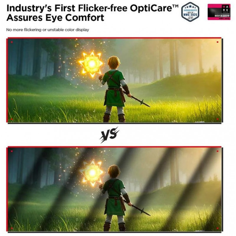 OptiCare hoolitseb sinu silmade mugavuse eest. 3840 Hz DC- ja PWM-hämarduse kasutamine kõrvaldab peaaegu täielikult pildivärina, vähendades oluliselt silmade väsimust pikaajalisel kasutamisel. 20 heledustaseme abil saad valguse intensiivsust täpselt oma keskkonnale vastavaks reguleerida. TÜV SÜD sertifikaat kinnitab madalat sinise valguse emissiooni ja värinavaba pilti, muutes ka pikad ekraani ees veedetud sessioonid silmadele ohutuks.