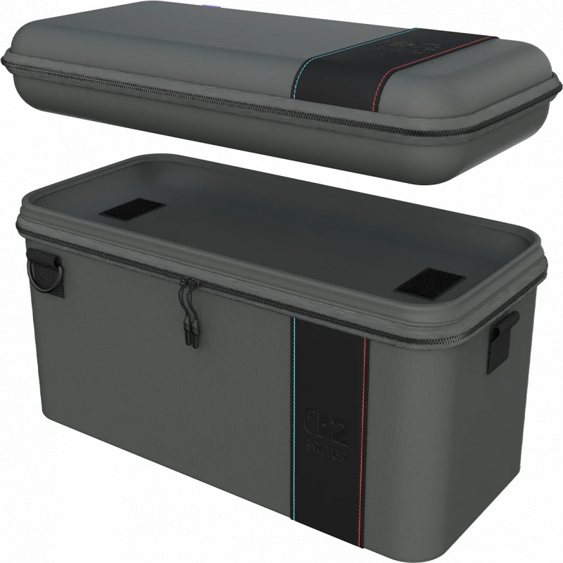 Eemaldatav PlayTrek reisivutlar konsooli jaoks ning alumine mahukas sahtel suuremate tarvikute organiseerimiseks – dokk, toiteadapter, Joy-Con'id ja juhtmevaba pult leiavad kõik kindla koha.