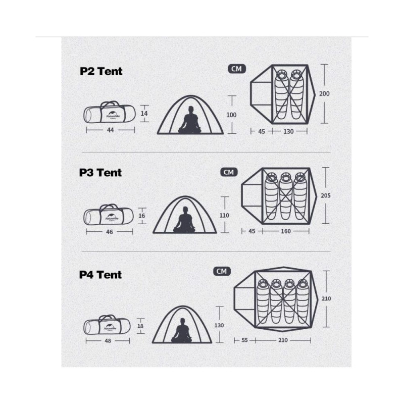 Naturehike P-seeria telk mahutab kuni kolm inimest ning on valmistatud tulekindlast kangast, UV-kaitsega ja veekindlast materjalist. Komplekti kuuluvad põhjariie, ventilatsioonivõrk, kahekordsed uksed ning telgi kaal on 2,3 kg. Kokkupanduna on telgi mõõtmed 46 x 16 cm.