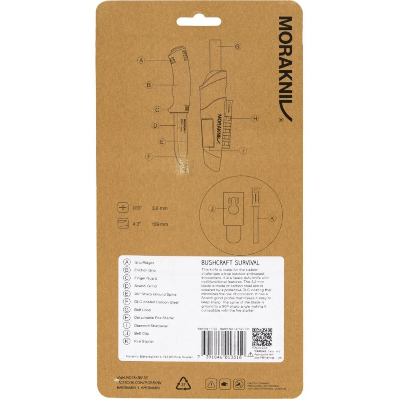 This stainless steel knife has everything a real bushcraft enthusiast needs. It’s a heavy-duty, sturdy knife, with a sheath that comes with an integrated fire starter and a diamond sharpener, making it the ultimate survival knife.<br><br>The carbon steel blade has a black DLC coating that protects it from rust to some extent and also prevents reflections from the blade. Keep in mind that carbon steel requires maintenance, so make it a habit to wipe the knife and oil it after usage. The spine has been ground so that you can use the knife together with a fire starter – so your critical fire is never far away. The knife sheath has a belt loop and clip, of course, keeping your knife always close at hand. The knife sheath has a MOLLE compatible cover made of strong nylon giving you a range of different mounting alternatives.<br><br><b>A jet-black survivor</b><br>This stainless steel knife has everything a real bushcraft enthusiast needs. It’s a heavy-duty, sturdy knife, with a sheath that comes with an integrated fire starter and a diamond sharpener, making it the ultimate survival knife.<br><br><b>Fire Steel Compatible</b><br>This knife has a ground spine. The blade hasn’t been polished/buffed and the spine corners are sharp, which make knives with this grinding excellent for use with a fire starter. The adventure awaits!Morakniv Survival. Knife type: Hunting knife, Blade shape: Drop point, Blade material: Carbon steel. Overall length: 23.2 cm, Blade length: 10.9 cm
