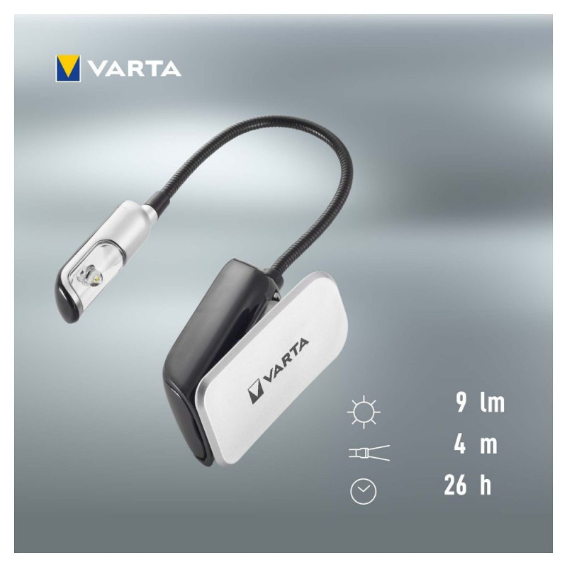 Varta 16618. Taskulambi tüüp: Klambriga taskulamp, toote värvus: must, hõbe, korpuse materjal: plast. Lambitüüp: LED, lampide arv: 1 lamp, valgusvoog: 9 lm. Aku/patarei tüüp: CR 2032, aku/patarei tööaeg: 26 h. Kõrgus: 255 mm, kaal: 36 g. Kogus pakendis: 1 tk, pakendi laius: 100 mm, pakendi sügavus: 33 mm.