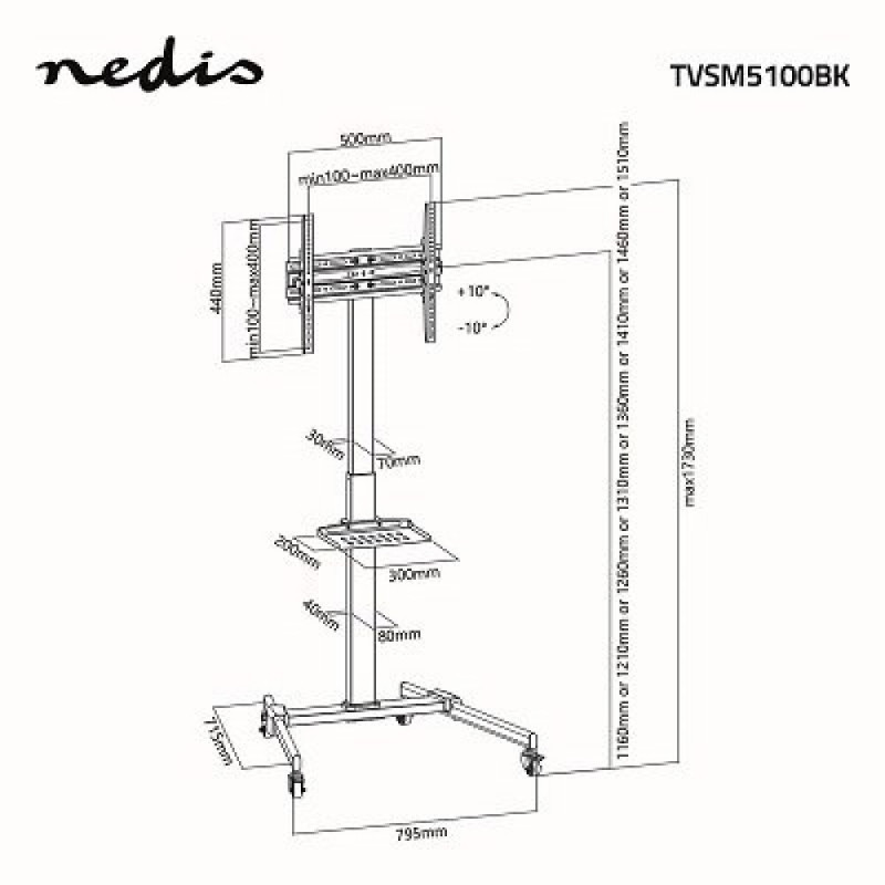 TV shelf with bracket NEDIS Manufacturer: NEDIS Product parameters: Fits TVs up to ("): 55" Height (cm): 173 Width (cm): 79.5 Bruise (cm): 71.5 Maximum load (kg): 35 VESA up to (mm): 400x400 Sharp: Black Wheels: YesOsta kohe, viimased eksemplarid laos!