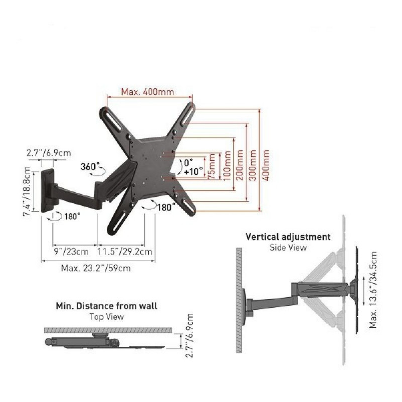 For screen size: 23-55" VESA standard: 100x100, 200x100, 100x200, 200x200, 400x200, 400x400 mm Tilt: -5 ° ~ + 15 ° Rotatable: + 90 ° ~ -90 ° Screen level +5° ~ -5° Distance to the wall: 61-565 mm Vertical range of motion: 345 mm Maximum load: 30 kg NOsta kohe, viimased eksemplarid laos!