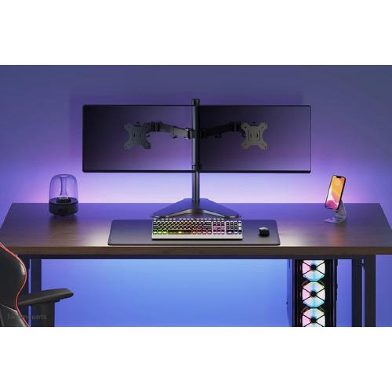 The Neomounts desk mount, model FPMA-D550DDBLACK is a tilt-, swivel and rotatable desk mount for 2 flat screens up to 32". This mount is a great choice for space saving placement on desks using a desk stand.<br><br>Neomounts versatile tilt (90°), rotate (360°) and swivel (180°) technology allows the mount to change to any viewing angle to fully benefit from the capabilities of the flat screen. The mount is manually height adjustable from 0 to 46 centimetres. Depth adjustable from 4 to 40 centimetres. An innovative cable management conceals and routes cables from mount to flat screen. Hide your cables to keep the workplace nice and tidy.<br><br>Neomounts FPMA-D550DDBLACK has three pivot points and is suitable for screens up to 32". The weight capacity of this product is 8 kg each screen. The desk mount is suitable for screens that meet VESA hole pattern 75x75 or 100x100mm. Different hole patterns can be covered using Neomounts VESA adapter plates.<br><br>By using an ergonomic mount neck- and back complaints can be avoided. Ideal for use in offices and on counters or in a reception area.<br><br>All installation material is included with the product.Neomounts FPMA-D550DDBLACK Monitor stand 10-32". Mounting: Freestanding, Maximum weight capacity: 8 kg, Minimum screen size: 25.4 cm (10"), Maximum screen size: 81.3 cm (32"), Minimum VESA mount: 75 x 75 mm, Maximum VESA mount: 100 x 100 mm. Height adjustment, Tilt angle range: 0 - 90°. Product colour: Black