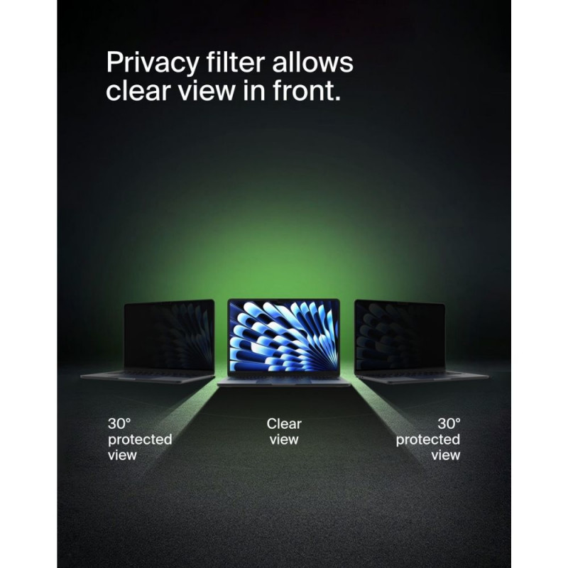Kaitske oma privaatsust MacBooki kasutamisel ka avalikes kohtades. Eriline disain võimaldab selget peegeldusvastast vaadet eestpoolt, samal ajal kui ekraan on varjatud kõrvaliste pilkude eest 30° ulatuses mõlemal küljel. Eemaldatav, pestav ja korduvkasutatav privaatsusekraan on hõlpsasti hoiustatav kaasasoleval TruePrivacy paneelil.