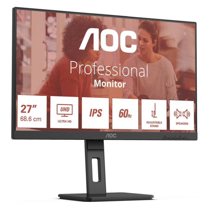 **AOC E3 U27E3UF** Ekraani diagonaal: 68,6 cm (27"), ekraani resolutsioon: 3840 x 2160 pikslit, HD-tüüp: 4K Ultra HD, ekraanitehnoloogia: LED, reageerimisaeg: 4 ms, algne kuvasuhe: 16:9, vaatenurk horisontaalselt: 178°, vaatenurk vertikaalselt: 178°. Sisseehitatud kõlarid. Integreeritud USB-jaotur, USB-jaoturi versioon: 3.2 Gen 1 (3.1 Gen 1). VESA-kinnitus, kõrguse reguleerimine. Toote värvus: must.