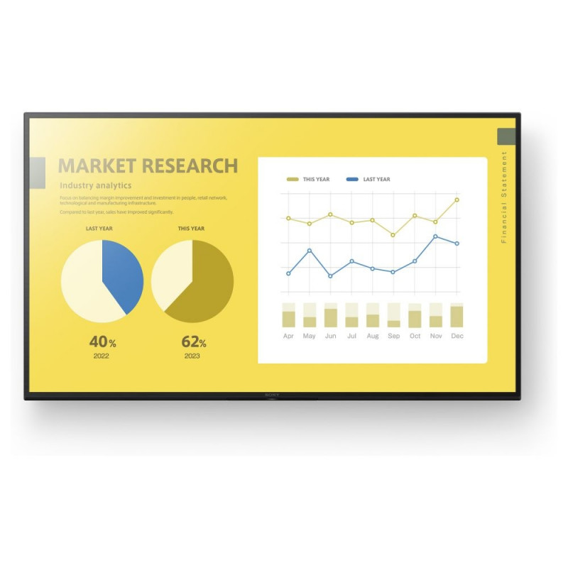 Sony FW-43EZ20L. Tootedisain: Digitaalne sildiekraan. Ekraani diagonaal: 109,2 cm (43"), ekraani tehnoloogia: LED, ekraani resolutsioon: 3840 x 2160 pikslit, heledus: 350 cd/m², HD-tüüp: 4K Ultra HD. WLAN. Tööaeg (tundi/päevas): 16/7. Paigaldatud operatsioonisüsteem: Android. Toote värvus: must.