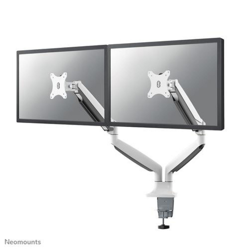 The Neomounts desk mount, model NM-D750DWHITE is a tilt-, swivel and rotatable desk mount for 2 flat screens up to 32". This mount is a great choice for space saving placement on desks using a desk clamp or grommet mount.<br><br>Neomounts' unique tilt (180°), rotate (180°) and swivel (180°) technology allows the mount to change to any viewing angle to fully benefit from the capabilities of the flat screen. The mount is easily individually height adjustable from 17 to 51 centimetres using a gas spring. Depth adjustable from 0 to 61 centimetres. A unique cable management conceals and routes cables from mount to flat screen. Hide your cables to keep the workplace nice and tidy.<br><br>Neomounts NM-D750DWHITE has three pivot points and is suitable for screens up to 32" (82 cm). The weight capacity of this product is 9 kg each screen. The desk mount is suitable for screens that meet VESA hole pattern 75x75 or 100x100mm. Different hole patterns can be covered using Neomounts VESA adapter plates.<br><br>By using an ergonomic mount neck- and back complaints can be avoided. Ideal for use in offices and on counters or in a reception area.<br><br>All installation material is included with the product.Neomounts NM-D750DWHITE Monitor arm 10-32" - gas spring. Mounting: Clamp/Grommet, Maximum weight capacity: 9 kg, Minimum screen size: 25.4 cm (10"), Maximum screen size: 81.3 cm (32"), Minimum VESA mount: 75 x 75 mm, Maximum VESA mount: 100 x 100 mm. Height adjustment, Swivel angle range: -90 - 90°, Tilt angle range: -90 - 90°. Product colour: White