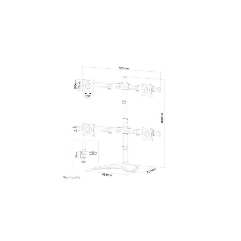The Neomounts desk mount, model NM-D335D4BLACK is a tilt-, swivel and rotatable desk mount for 4 flat screens up to 27". This mount is a great choice for space saving placement on desks using a desk clamp, desk stand or desk grommet.<br><br>Neomounts versatile tilt (90°), rotate (360°) and swivel (30°) technology allows the mount to change to any viewing angle to fully benefit from the capabilities of the flat screen. The mount is manually height adjustable from 0 to 80 centimetres.An innovative cable management conceals and routes cables from mount to flat screen. Hide your cables to keep the workplace nice and tidy.<br><br>Neomounts NM-D335D4BLACK has one pivot point and is suitable for 4 screens up to 27" (69 cm). The weight capacity of this product is 8 kg each screen. The desk mount is suitable for screens that meet VESA hole pattern 75x75 or 100x100mm. Different hole patterns can be covered using Neomounts VESA adapter plates.<br><br>By using an ergonomic mount neck- and back complaints can be avoided. Ideal for use in offices and on counters or in a reception area.<br><br>All installation material is included with the product.Neomounts NM-D335D4BLACK Monitor stand 10-27". Mounting: Clamp/Freestanding/Grommet, Minimum screen size: 25.4 cm (10"), Maximum screen size: 68.6 cm (27"), Minimum VESA mount: 75 x 75 mm, Maximum VESA mount: 100 x 100 mm. Height adjustment, Swivel angle range: -15 - 15°, Tilt angle range: -45 - 45°. Product colour: Black