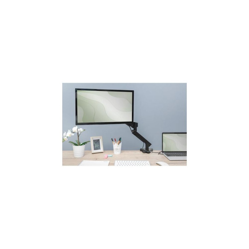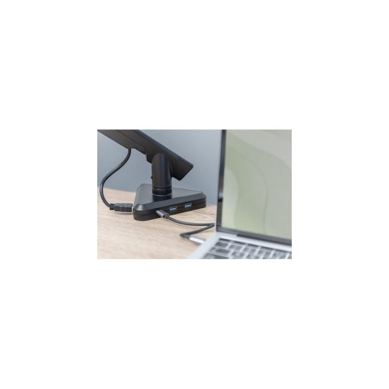 Monitor bracket and docking station in one – ergonomic design combined with practical mobile device connection<br><br>- Perfectly adjusted ergonomic monitor position for all heights<br>- Integrated docking station with 5 additional ports for optimal connectivity<br>- With HDMI, VGA, USB A and USB-C™ interfaces incl. Power Delivery (PD 3.0 / 87 W max.)<br>- Supports resolutions of up to 4K (HDMI) and Full HD (VGA)<br>- Suitable for monitors with dimensions up to 30” / load capacity: 9 kg (VESA 75 / 100)<br>- Quick-release function enables rapid and easy attachment of monitors<br>- Flexible monitor arm with gas spring and integrated cable management<br>- Tidy desktop thanks to central device connections – ideal for home and office<br>- Suitable for flat and curved displays<br><br>The intelligent monitor arm solution with integrated docking station unites ergonomic design and comfort in an unprecedented manner. Users benefit from a perfectly ergonomically adapted monitor position and can also use their mobile devices such as notebooks, smartphones or tablets via a fixed monitor. The monitor arm supports displays with a screen diagonal from 15" to 30" (VESA 75 / 100) up to a maximum load of 9 kg. The integrated gas spring and quick-release function make it easier for you to position and clip in the monitor. You can access the interfaces of the integrated docking station centrally at the clamp mount. Use the HDMI, VGA and USB interfaces to connect your mobile device and also charge it via USB-C™ thanks to Power Delivery. Enjoy a tidy desk with the full connectivity of a docking station and the ergonomic advantages of the adjustable monitor bracket from DIGITUS®.Digitus Smart Monitor Mount with integrated Docking Station, Gas Pressure Spring and Clamp Mount. Mounting: Clamp, Maximum weight capacity: 9 kg, Minimum screen size: 38.1 cm (15"), Maximum screen size: 81.3 cm (32"), Minimum VESA mount: 75 x 75 mm, Maximum VESA mount: 100 x 100 mm. Height adjustment. Product colour: Black