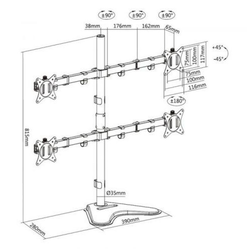"The equip® 650127 Monitor Desk Stand is a compact but sturdy product that ensures a reliable installation of your LCD/LED monitor.<br><br>Flexible design for ample adjustment and viewing angles, adjustable for either portrait or landscape orientation. The freestanding base provides stability and support on any work surface. A convenient phone slot located on the base. A detachable VESA plate for user-friendly installation.<br><br>Follow the graphic guide included in the package, you can install your monitor on your own with ease.<br><br>"<br>Equip 17"-32" Articulating Quad Monitor Tabletop Stand. Mounting: Freestanding, Maximum weight capacity: 36 kg, Minimum screen size: 43.2 cm (17"), Maximum screen size: 81.3 cm (32"), Minimum VESA mount: 75 x 75 mm, Maximum VESA mount: 100 x 100 mm. Height adjustment, Tilt angle range: -45 - 45°. Product colour: Black