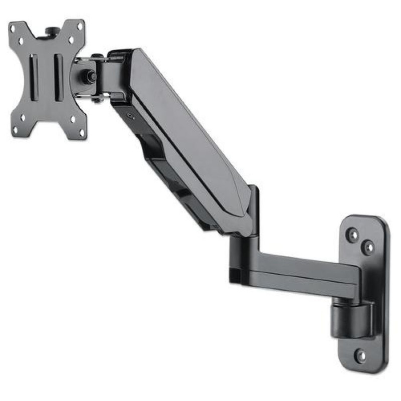 Enjoy easy display movement and more desktop workspace.<br><br>The Manhattan Universal Gas Spring Monitor Mount offers a single-jointed gas-spring arm that securely holds one 17" to 32" TV or monitor. This mount's gas spring promotes easy movement of the display to a more comfortable viewing angle with the lightest touch. Designed to give back much needed desktop real estate and maximize productivity, the Manhattan Universal Gas Spring Monitor Mount provides more flexibility, reach, and overall enjoyment of whatever task is at hand.Manhattan Wall Mount for TV & Monitors (Spring Arm 3 pivots), For screens 17" to 32", VESA compatability: 75x75mm and 100x100mm - check the dimensions of the four mounting holes on back of screen to ensure it fits, Max 8kg, Black, Bracket, Lifetime Warranty. Maximum weight capacity: 8 kg, Minimum screen size: 43.2 cm (17"), Maximum screen size: 81.3 cm (32"), Minimum VESA mount: 75 x 75 mm, Maximum VESA mount: 100 x 100 mm. Swivel angle range: -90 - 90°, Tilt angle range: -35 - 35°. Product colour: Black