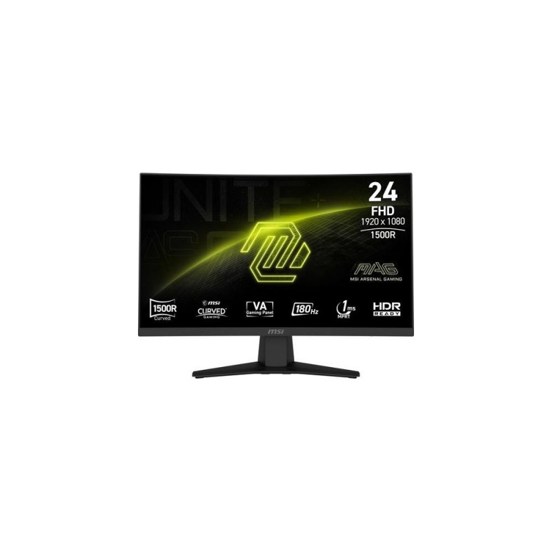 Experience immersive gaming with the MAG 244C gaming monitor. It features a 1920x1080 (FHD) panel, a 180Hz refresh rate, and a rapid 1ms (MPRT) response time. The monitor is HDR-ready, enhancing eye-catching details through adjustments in contrast and shadows. Designed for competitive FPS, first-person RPG/MMORPG, and flight/racing simulator genres, the MSI MAG 244C Curved Gaming Monitor takes casual gaming to a new level, challenging players to see beyond the game.<br><br>MSI MAG 244C. Display diagonal: 59.9 cm (23.6"), Display resolution: 1920 x 1080 pixels, HD type: Full HD, Display technology: LCD, Native aspect ratio: 16:9, Viewing angle, horizontal: 178°, Viewing angle, vertical: 178°. VESA mounting. Product colour: Black