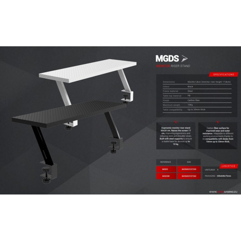 Level up your workspace with the MGDS monitor riser stand, designed to promote a healthier posture and boost your daily comfort. By raising your monitor by 17 cm, it allows you to align your screen at the perfect ergonomic height, reducing neck and shoulder strain. Featuring a carbon fiber top surface measuring 60x20 cm and a sturdy steel frame, this riser provides the durability and space you need to accommodate any monitor or device on your desk. Additionally, it allows for quick and secure installation with adjustable clamps, compatible with desks from 10 to 33 mm thick.