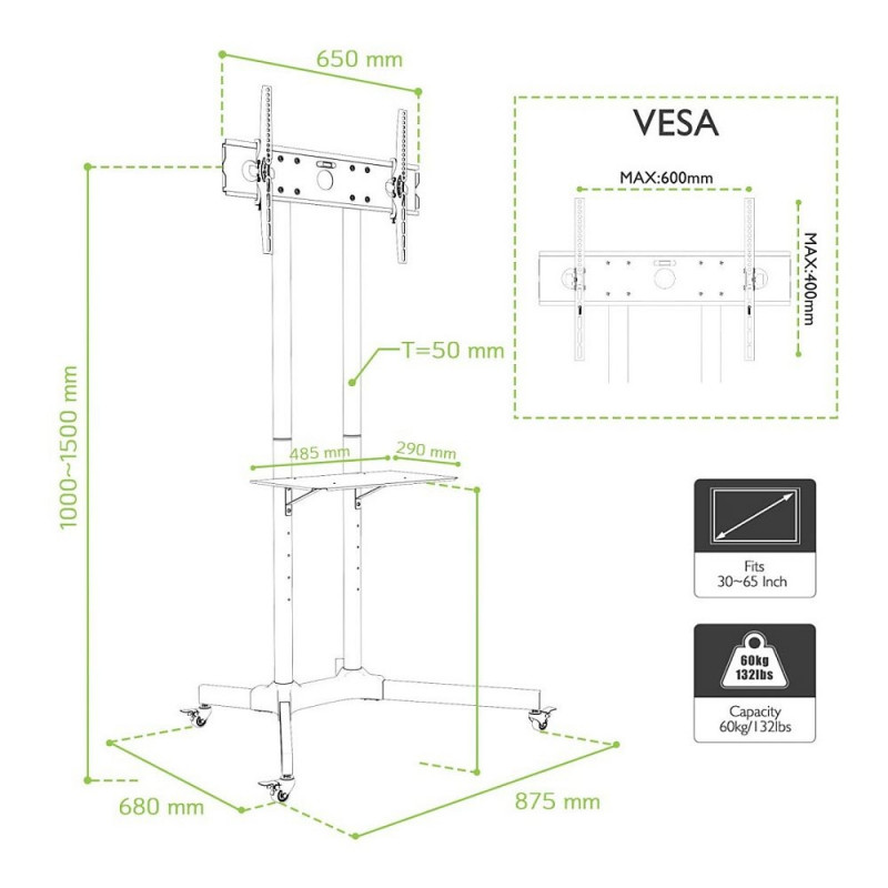 Techly ICA-TR6. Maksimaalne kandevõime: 60 kg, minimaalne ekraani suurus: 76,2 cm (30"), maksimaalne ekraani suurus: 165,1 cm (65"). Kaldenurga vahemik: -15 - 15°. Toote värv: Must