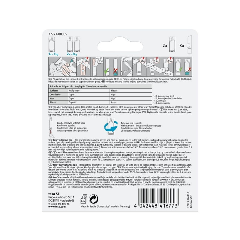 TESA 77773 MOUNTING SYSTEM. 2X1KG on usaldusväärne ja vastupidav kinnitussüsteem, mis võimaldab teil esemeid kaaluga kuni 2 kg (2 x 1 kg) lihtsalt ja turvaliselt kinnitada.