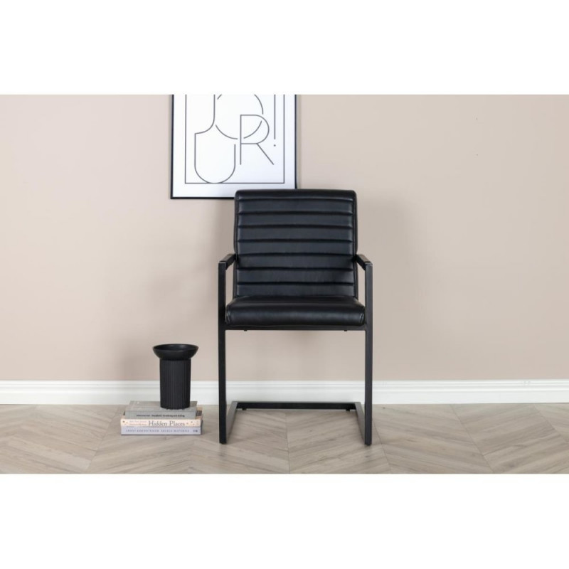 Art-seeria söögitool pakub teile tööstuslikus stiilis tugitooli, millel on maalähedane alusraam ning integreeritud käetoed mustast pulbervärvitud metallist. Lai seljatugi ja iste tagavad ekstra mugavuse, mustast kunstnahast iste ning kaunistusõmblused seljatoel ja istmel on kujundatud meeldiva mustriga.